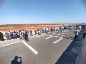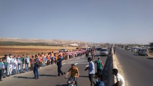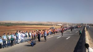 أنشأت منـ.ـظمات إنسـ.ـانية في محافظة إدلب صباح اليوم الجمعة سلسلة بشرية على الطريق الممتد من إدلب حتى معـ.ـبر “باب الهوى” الحدودي للمطالبة بتمديد تفويض آلية اﻷمم المتحدة لإدخال المسـ.ـاعدات الإنـ.ـسانية عبر الحدود.