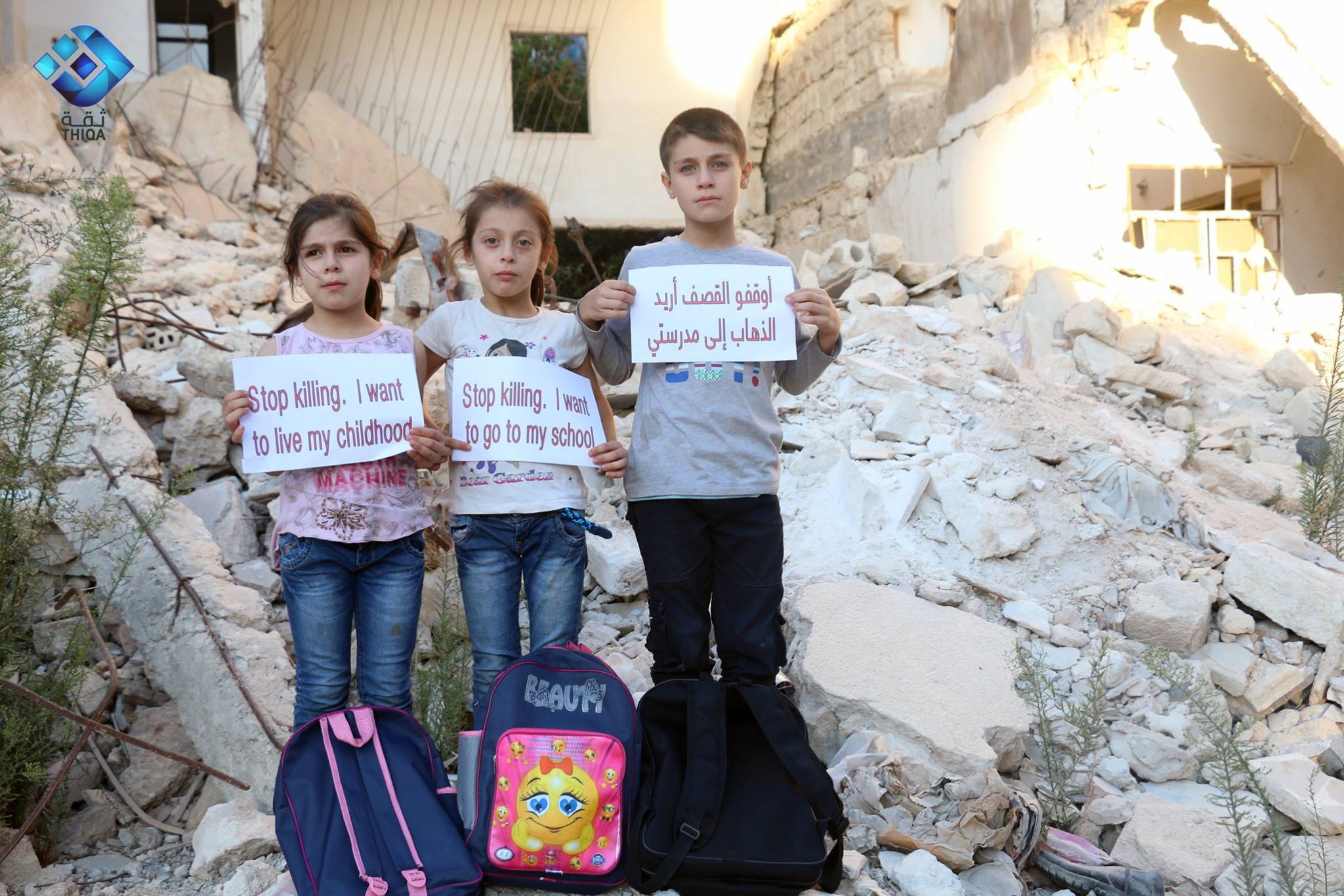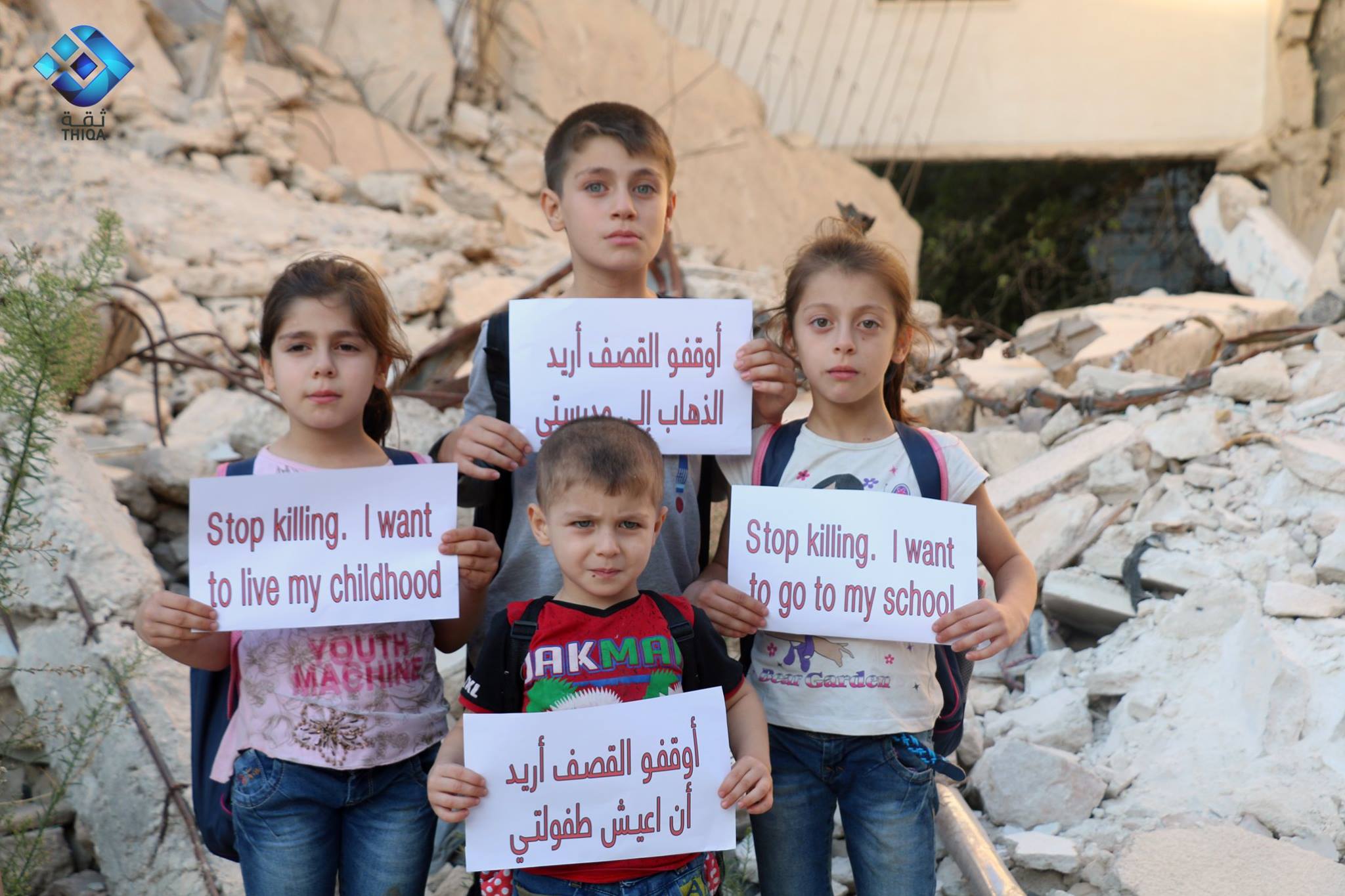 رفع أطفال سوريين في سن المدرسة لوحات تحمل رسائل الى العالم بأن أوقفوا القصف أريد أن اعيش طفولتي
