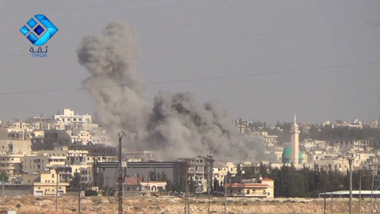 اللحظات الأولى للقصف بالطيران الحربي على مدينة #حريتان في ريف حلب الشمالي مخلفاً اضرارأً مادية