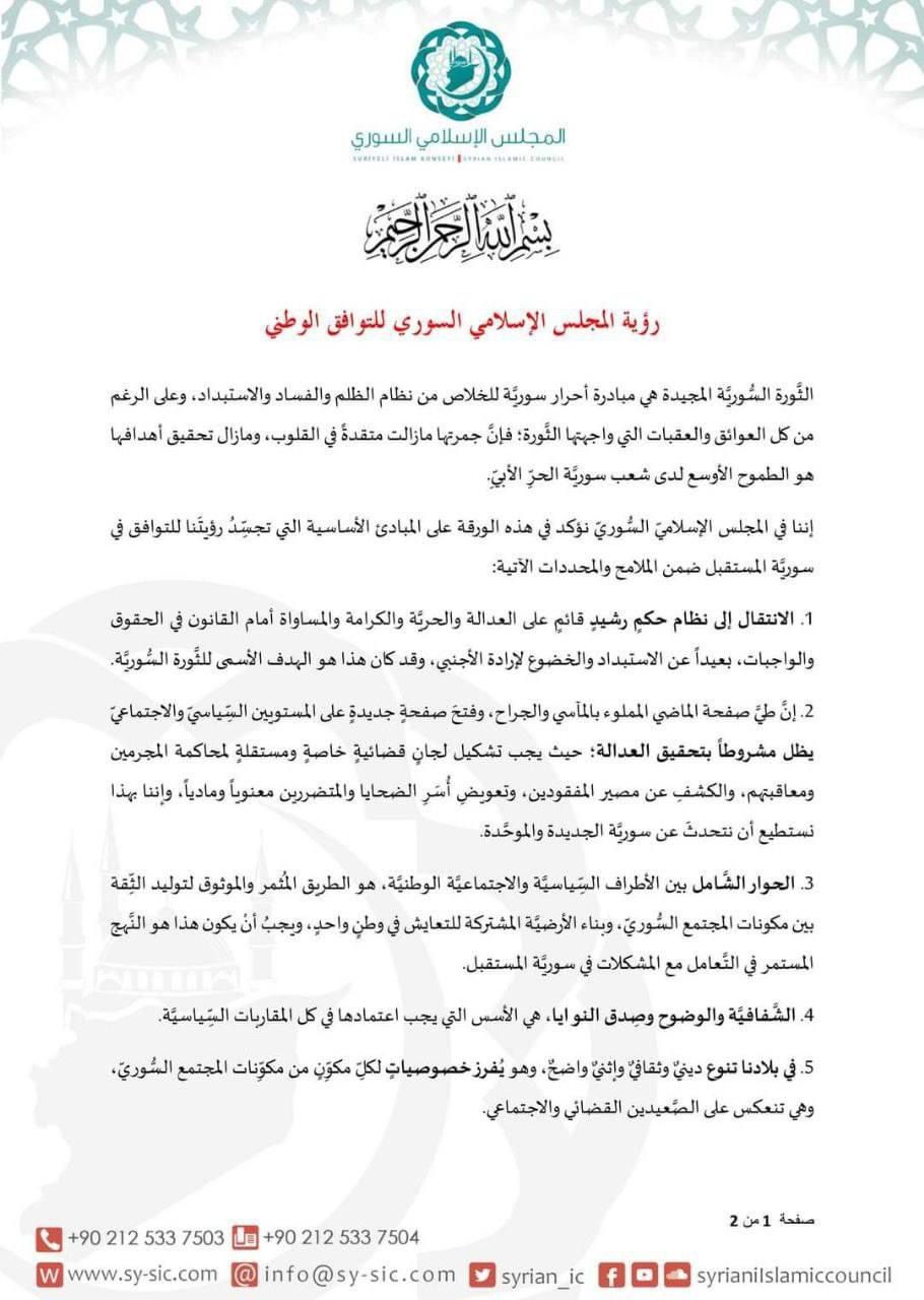 المجلس الإسلامي السوري يقدم ورقة شاملة للتوافق الوطني السوري (بيان)