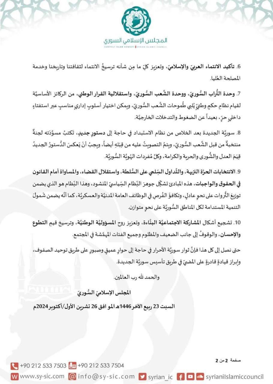 وأشار ضمن بيانه إلى الحاجة إلى دستور جديد يُصاغ من قبل لجنة منتخبة من الشعب، ويُعرض للاستفتاء الشعبي، بحيث يعكس قيم العدل والشورى والحرية والكرامة، ويجسد الهوية السورية بكامل تفاصيلها.