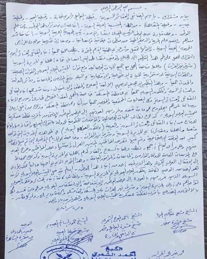 ودعا البيان أبناء العشائر العربية بالمنطقة إلى ضرورة حمل السلاح ضد الميليشيات في محافظات ديرالزور والحسكة والرقة وإفساح المجال أمام ميليشيات إيران ونظام الأسد للانضمام لصفوفهم للسيطرة على مناطق شرقي الفرات.