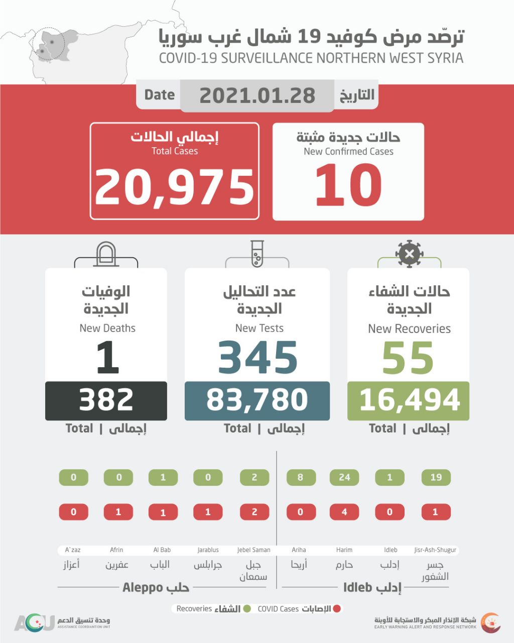 سجل مختبر الترصد الوبائي التابع لشبكة الإنذار المبكر، أمس الخميس، 10 إصابات جديدة بفيروس “كورونا” شمال غرب سوريا، لترتفع الحصيلة إلى 20.975 حالات.