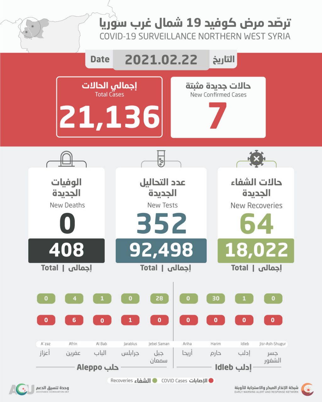 سجل مختبر الترصد الوبائي التابع لشبكة الإنذار المبكر، أمس الاثنين، 7 إصابات جديدة بفيروس “كورونا” شمال غرب سوريا، لترتفع الحصيلة إلى 21.136 حالة.