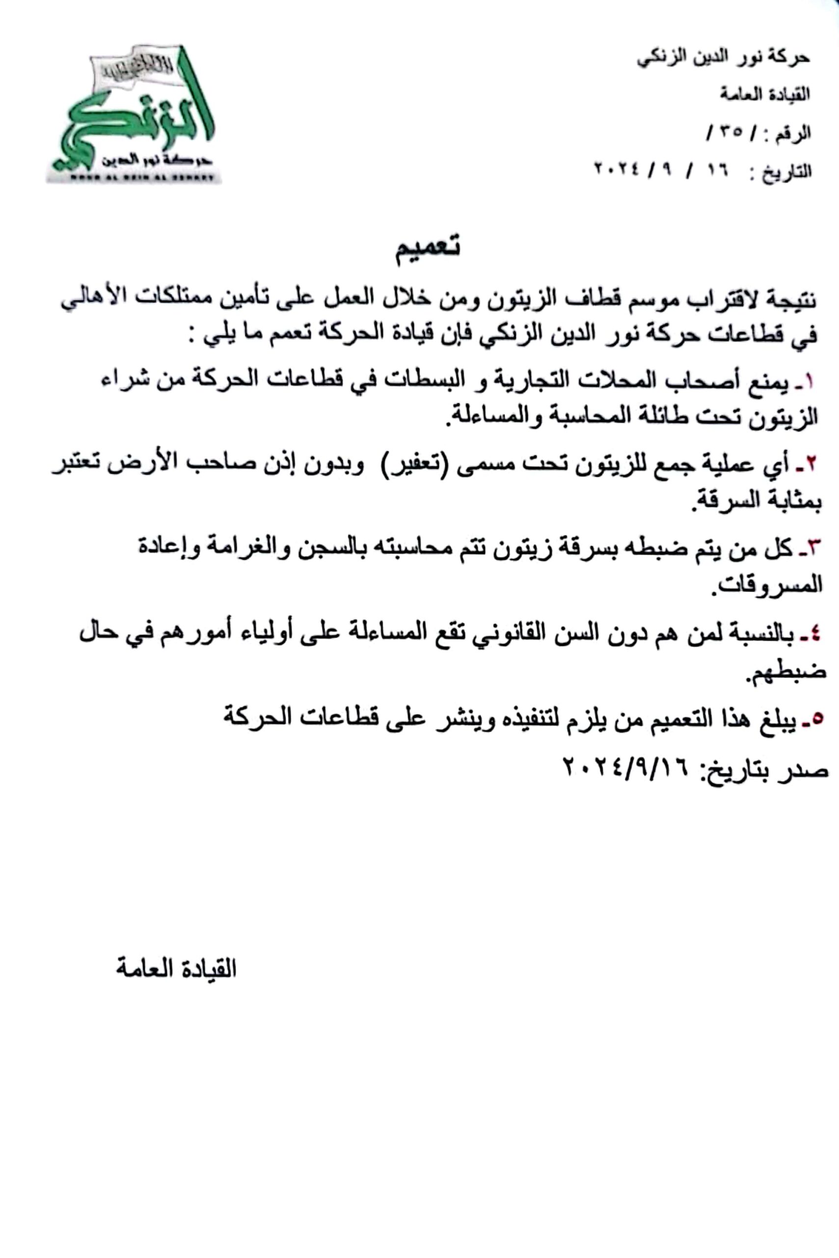 أصدرت قيادة حركة نور الدين الزنكي، اليوم، تعميماً جديداً مع اقتراب موسم قطاف الزيتون، يهدف إلى حماية ممتلكات الأهالي وضمان عدم سرقة محاصيلهم في قطاعات الحركة.