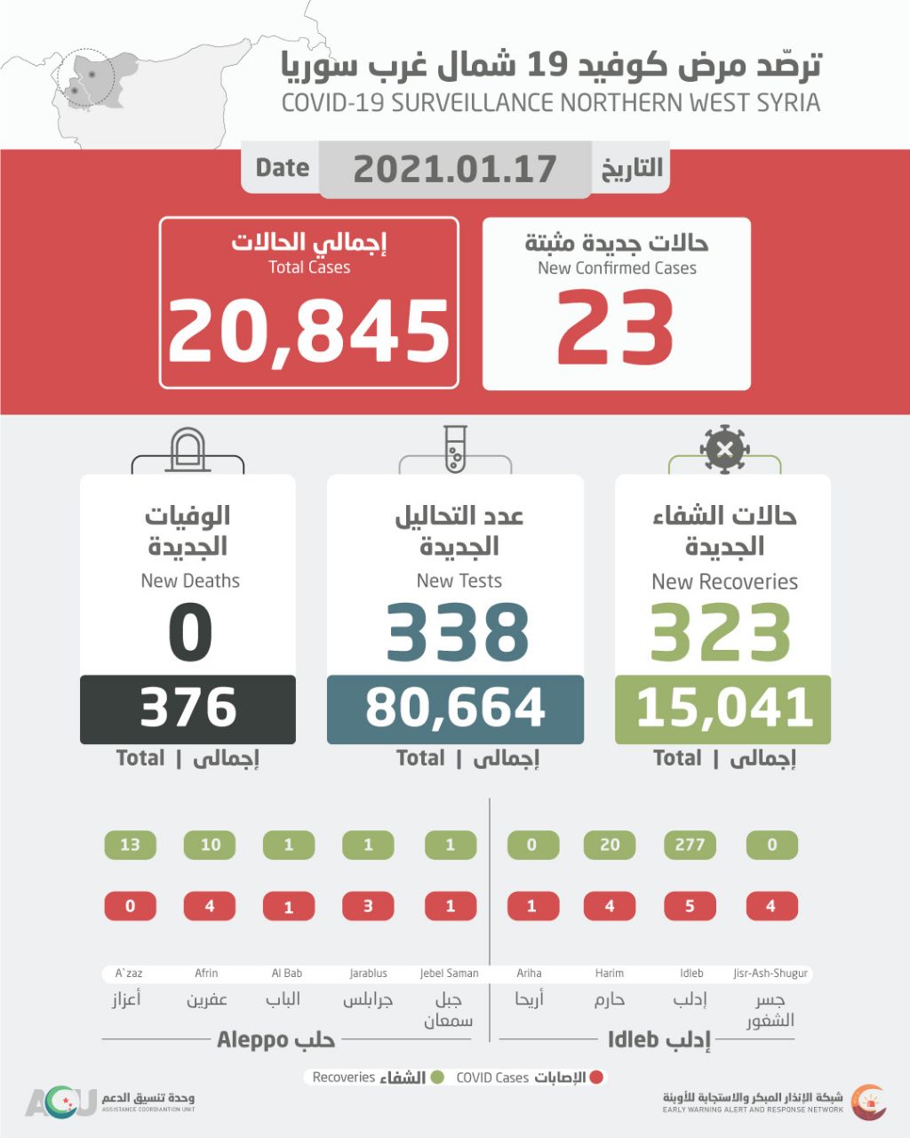 سجل مختبر الترصد الوبائي التابع لشبكة الإنذار المبكر، أمس الأحد، 23 إصابة جديدة بفيروس “كورونا” شمال غرب سوريا، لترتفع الحصيلة إلى 20.845 حالة.