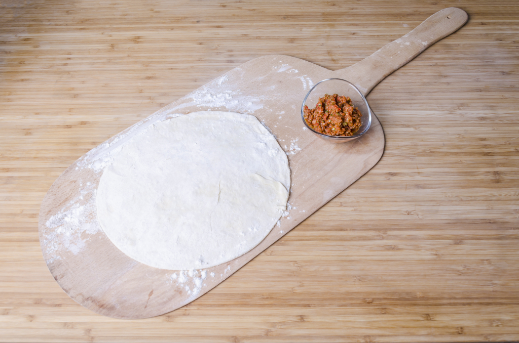 نفرد كرات العجين على سطحٍ مستوٍ لنحصل على شكل دائري.