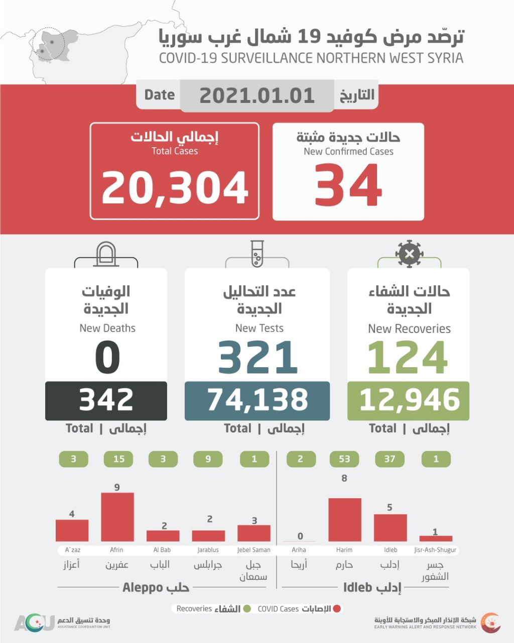 سجل مختبر الترصد الوبائي التابع لشبكة الإنذار المبكر، أمس الجمعة، 34 إصابة جديدة بفيروس “كورونا” شمال غرب سوريا، لترتفع الحصيلة إلى 20.304 حالة.