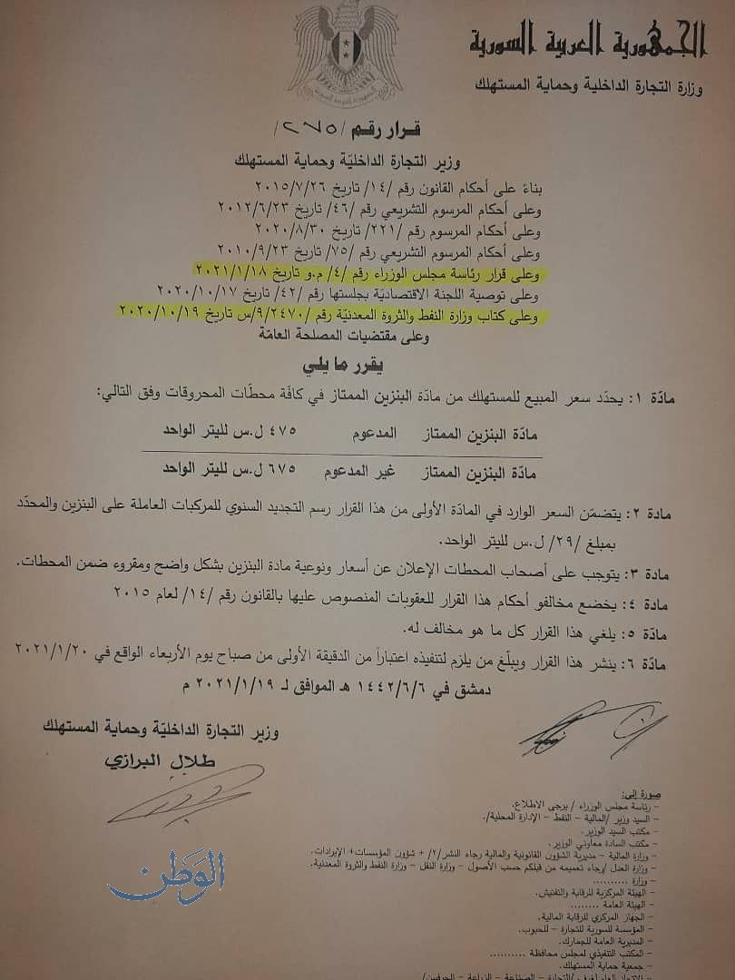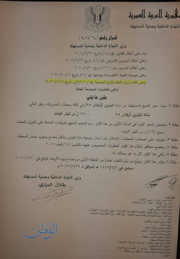 وبحسب بيان الوزارة فإن سعر الليتر المدعوم أصبح ب 475 ليرة سورية بعد أن كان 450 ليرة سورية، وسعر الليتر غير المدعوم بـ 675 ليرة ارتفاعا من 650 ليرة، كما وزادت سعر ليتر البنزين (أوكتان 95) ليصبح 1300 ليرة، ارتفاعا من 1050 ليرة.