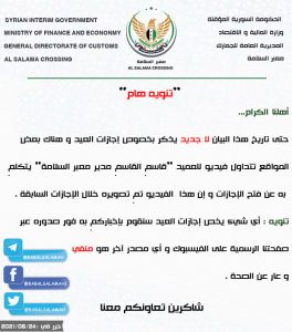 نـ.ـفت إد.ار.ة “مـ.ـعبـ.ـر با.ب الـ.ـسلامـ.ـة” الـ.ـحدو.دي مع تر.كيـ.ـا في ريـ.ـف حلـ.ـبـ.ـ، الـ.ـإشـ.ـاعـ.ـات حو.ل فتـ.ـح البا.ب أمـ.ـا.م الـ.ـلاجئـ.ـين الـ.ـسوريـ.ـين الراغبيـ.ـن بقـ.ـضا.ء “إ.جا.زة الـ.ـعيد”.