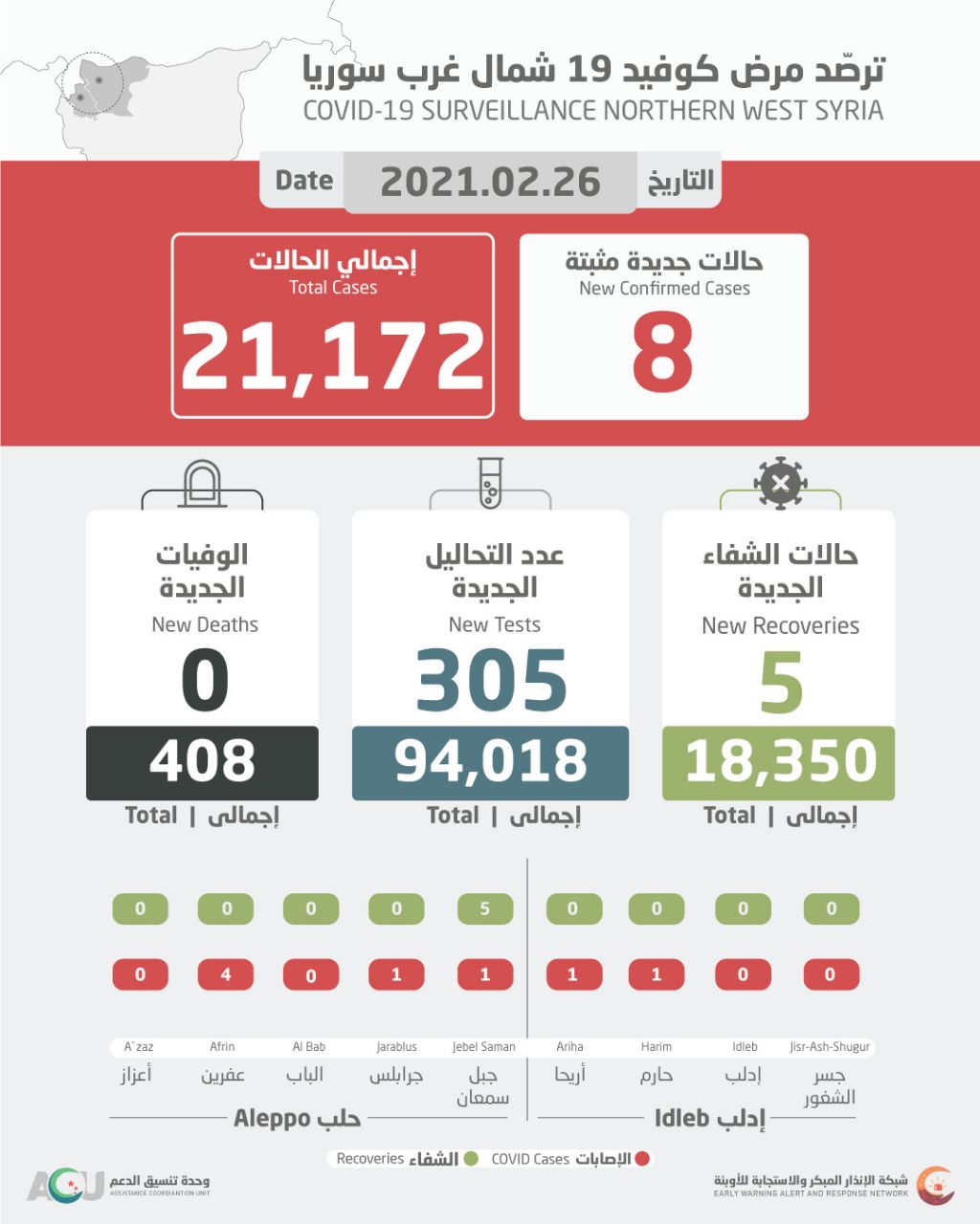 سجل مختبر الترصد الوبائي التابع لشبكة الإنذار المبكر، أمس الجمعة، 8 إصابات جديدة بفيروس “كورونا” شمال غرب سوريا، لترتفع الحصيلة إلى 21.172 حالة.