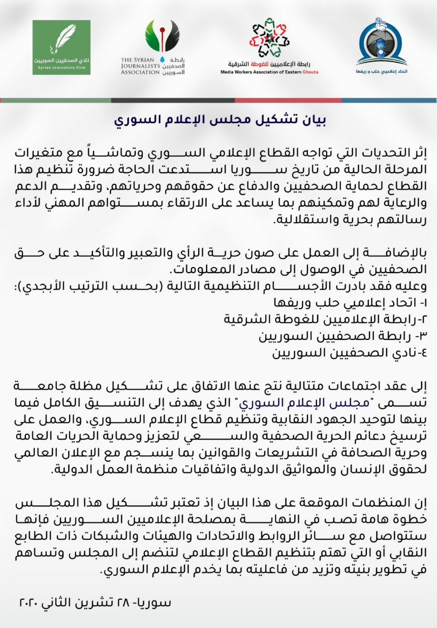 وأكّد البيان الذي وقعه كلاً من “اتحاد اعلاميي حلب وريفها”، و”رابطة الإعلاميين للغوطة الشرقية”، و”رابطة الصحفيين السوريين”، و”نادي الصحفيين السوريين”، على أنّ المجلس يهدف لفتح قنوات اتصال مع سائر النقابات والهيئات والأجسام الإعلامية لرفع سوية العمل الإعلامي بما ينسجم مع الإعلان العالمي لحقوق الإنسان والمواثيق الدولية واتفاقيات منظمة العمل الدولية.