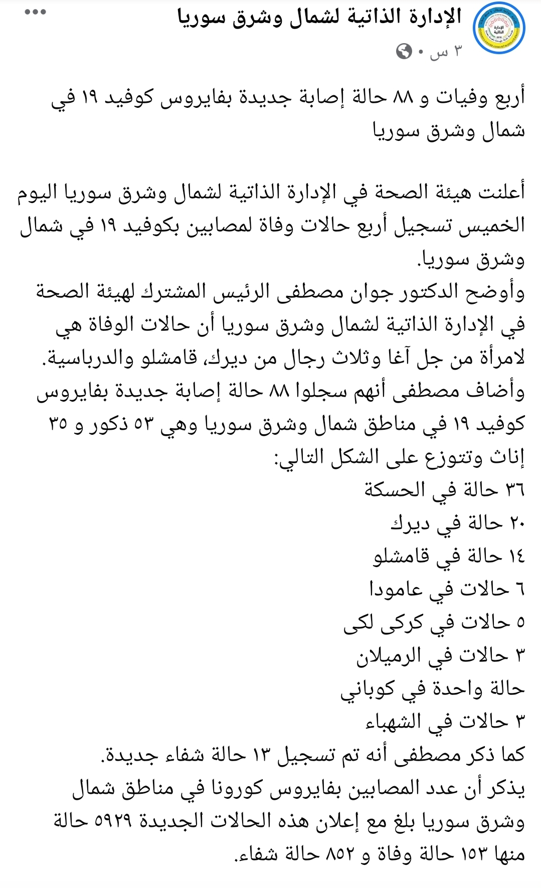 أعلنت هيئة الصحة في الإدارة الذاتية لشمال وشرق سوريا، في بيان لها، اليوم الخميس، عن تسجيل 88 حالة و4 حالات وفاة بفيروس كورونا المستجد (كوفيد -19).