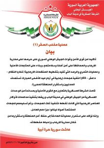 أعلن الجيـ.ـش الوطـ.ـني السوري، في بيان، عن عملـ.ـية أمـ.ـنية جديدة بالتعاون مع الشـ.ـرطة العسـ.ـكرية في مدينة الباب بريف حلب الشرقي، اعتباراً من صباح اليوم اﻹثنين.