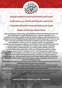 ناشـ.ـدت عـ.ـشـ.ـائر درعا البـ.ـلد، في بيـ.ـانين منفـ.ـصلـ.ـين، اليـ.ـوم السـ.ـبت، كـ.ـلا من مـ.ـلك الأردن، عبد الله بن الحـ.ـسـ.ـين، واﻷمـ.ـين العـ.ـام للأمم المتـ.ـحدة أنطـ.ـونيـ.ـو غوتـ.ـيـ.ـرش، للتـ.ـدخل لوقـ.ـف الانتهـ.ـاكـ.ـات بحـ.ـق المـ.ـدنـ.ـيين.