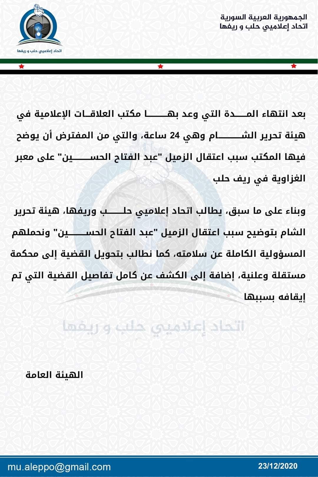 من جانبه، أصدر اتحاد إعلاميي حلب وريفها بياناً طالب خلاله تحرير الشام بالكشف عن حقيقة توقيف الحسين، وإصدار توضيح بخصوص تلك الحادثة.