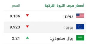 وبلغت قيمة الدولار الأمريكي، صباح اليوم، 8.186 ليرة تركية.