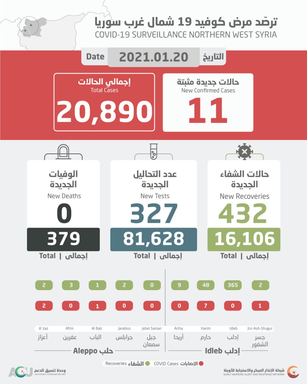 سجل مختبر الترصد الوبائي التابع لشبكة الإنذار المبكر، أمس الأربعاء، 11 إصابة جديدة بفيروس “كورونا” شمال غرب سوريا، لترتفع الحصيلة إلى 20.890 حالات.
