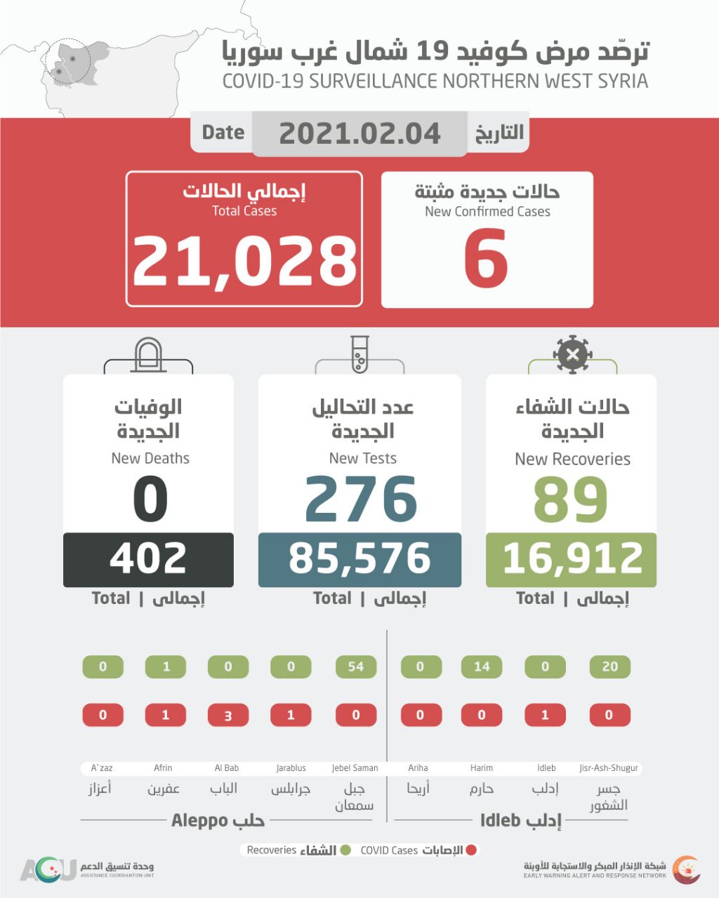 سجل مختبر الترصد الوبائي التابع لشبكة الإنذار المبكر، أمس الخميس، 6 إصابات جديدة بفيروس “كورونا” شمال غرب سوريا، لترتفع الحصيلة إلى 21.028 حالات.