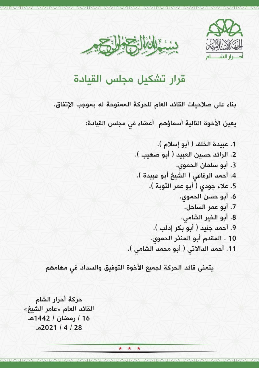 وجاء في البيان التي حصلت عليه وكالة ثقة أنه وبناء على صلاحيات القائد العام للحركة الممنوحة بموجب الاتفاق يعين الأخوة التالية اسماؤهم أعضاء في مجلس القيادة وهم: “عبيدة الخلق وحسين العبيد وأبو سلمان الحموي، وأحمد الرفاعي، وعلاء جودي، وأبو حسن الحموي، وأبو عمر الساحل، وابو الخير الشامي، احمد جنيد، وأبو منذر الحموي، وأحمد الدالاتي”.