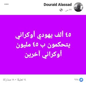 وقال دريد في منشور على صفحته بموقع “فيس بوك” إن “45 ألف يهودي أوكراني يتحكمون ب 45 مليون أوكراني آخرين”!.