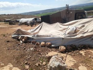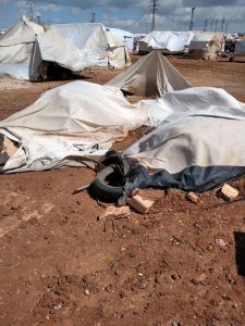 وقد أدت الرياح القوية والأمطار الغزيرة إلى تمزيق واقتلاع الخيام وتشريد قاطنيها في ظل غياب المنظمات الإنسانية.