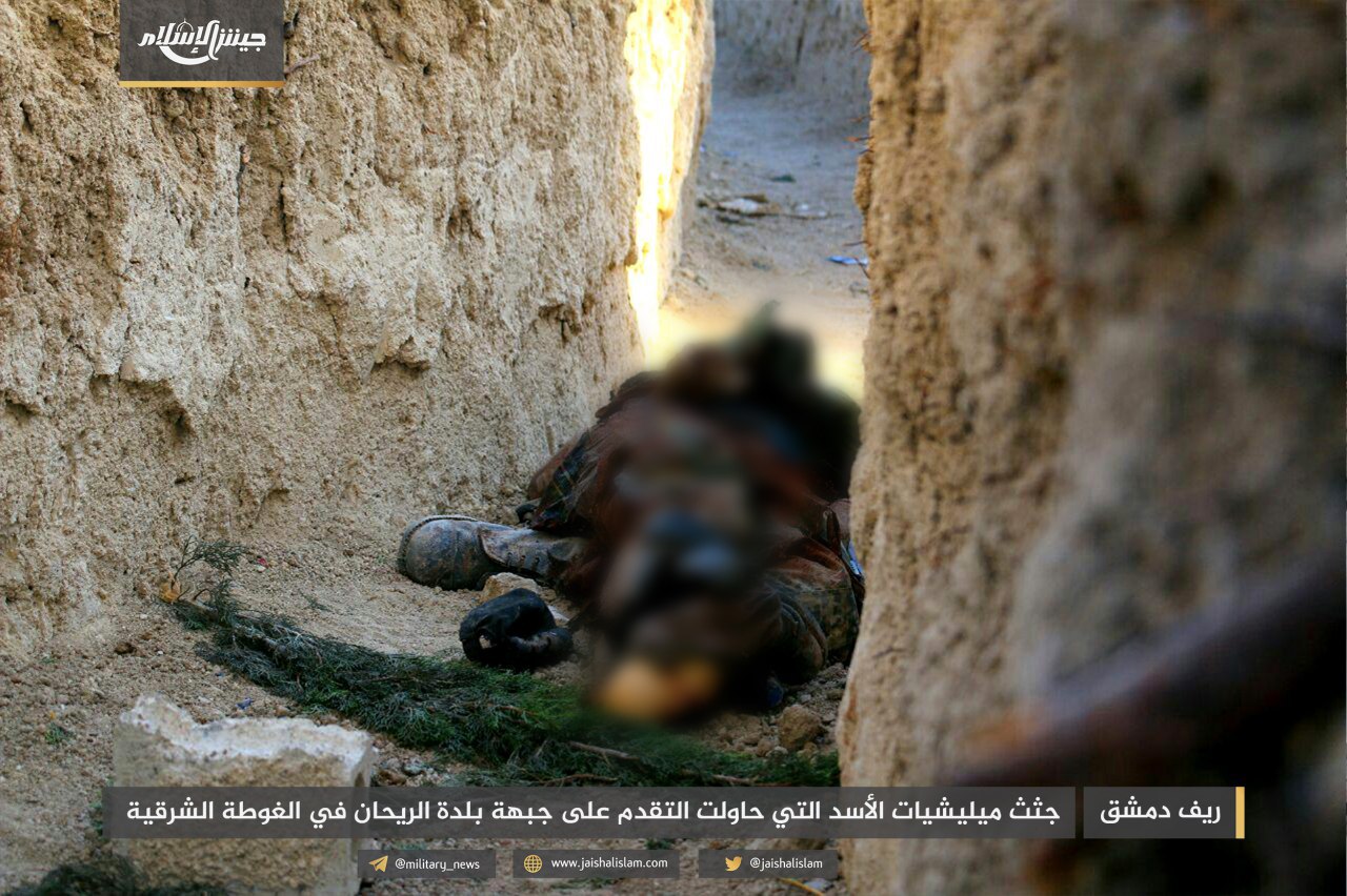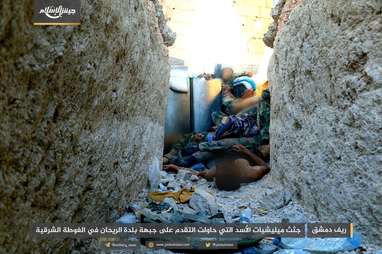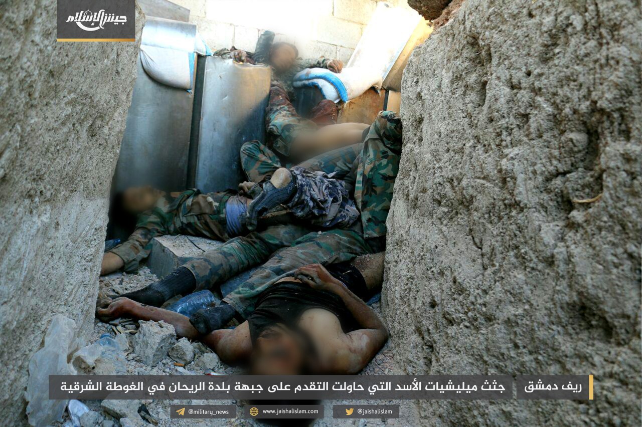 ونشر المكتب الإعلامي لـ”جيش الإسلام” صوراً تظهر قتلى قوات الأسد، بينهم الملازم أول “مصطفى السعيد”، قائد إحدى مدرعات قوات النظام التي دُمّرت على جبهة الريحان، إضافة إلى الملازم “أحمد عباس”.
