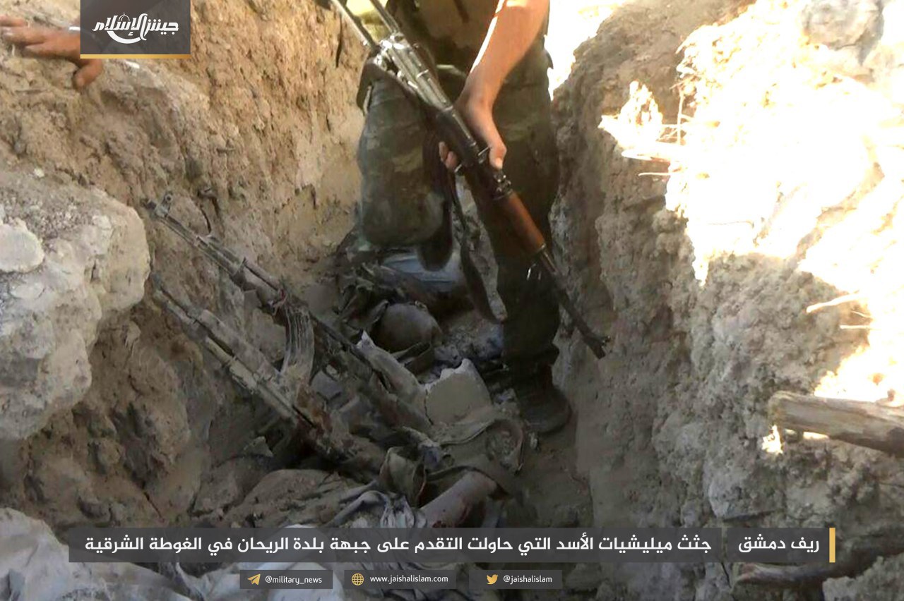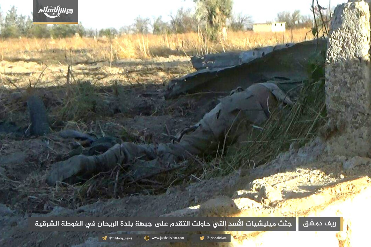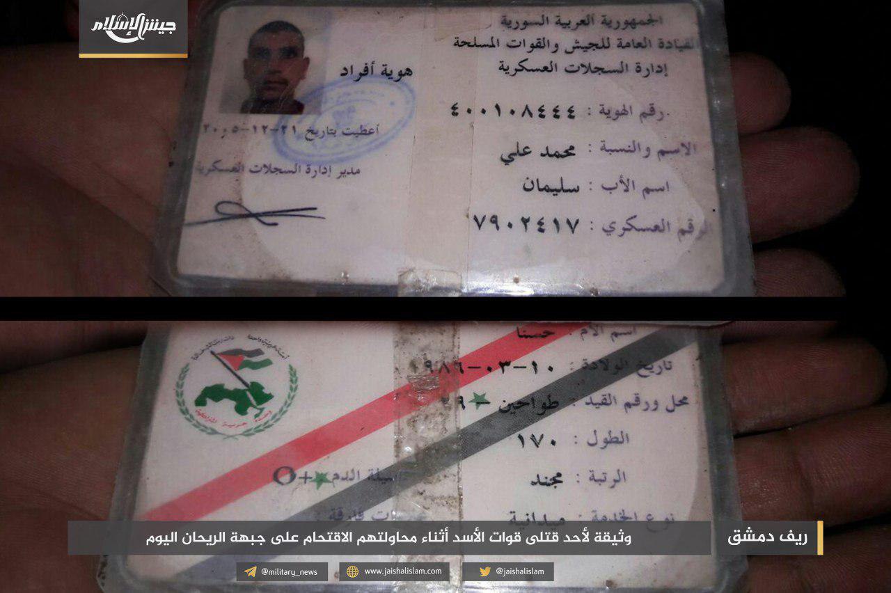 ونشر المكتب الإعلامي لـ”جيش الإسلام” صوراً تظهر قتلى قوات الأسد، بينهم الملازم أول “مصطفى السعيد”، قائد إحدى مدرعات قوات النظام التي دُمّرت على جبهة الريحان، إضافة إلى الملازم “أحمد عباس”.