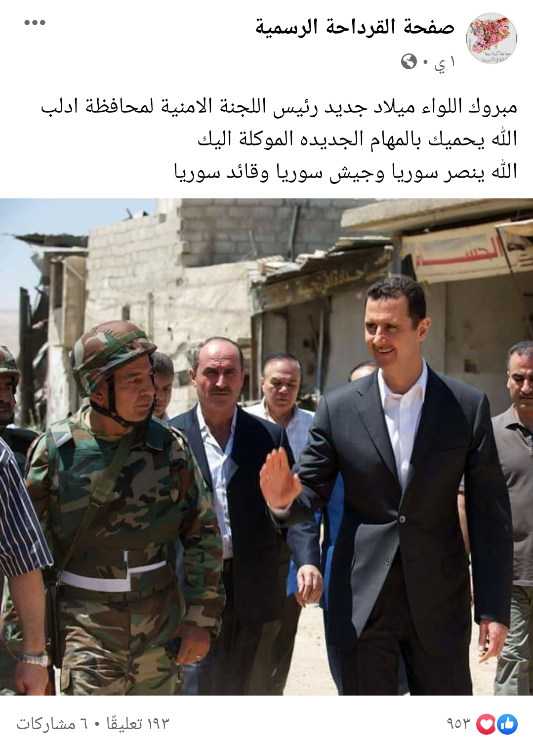 ونشرت صفحة “القرداحة اليوم“، على صفحتها في فيسبوك، خبرا مفاده “مبروك اللواء (ميلاد جديد) رئيس اللجنة الامنية لمحافظة إدلب”.