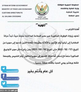وذكرت إدارة المعبر أن حركة المغادرة إلى تركيا تبدأ أيام الاثنين والثلاثاء والأربعاء للأشخاص الذين قدموا إلى سوريا من تاريخ 2023/02/17 حتى تاريخ 2023/03/02.