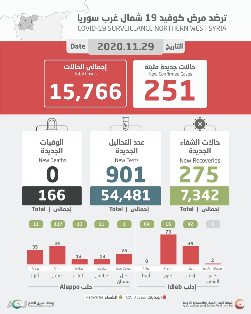 سجل مختبر الترصد الوبائي التابع لشبكة الإنذار المبكر، أمس الأحد، 251 إصابة جديدة بفيروس “كورونا” شمال غرب سوريا، لترتفع حصيلة المصابين إلى 15.515 إصابة.