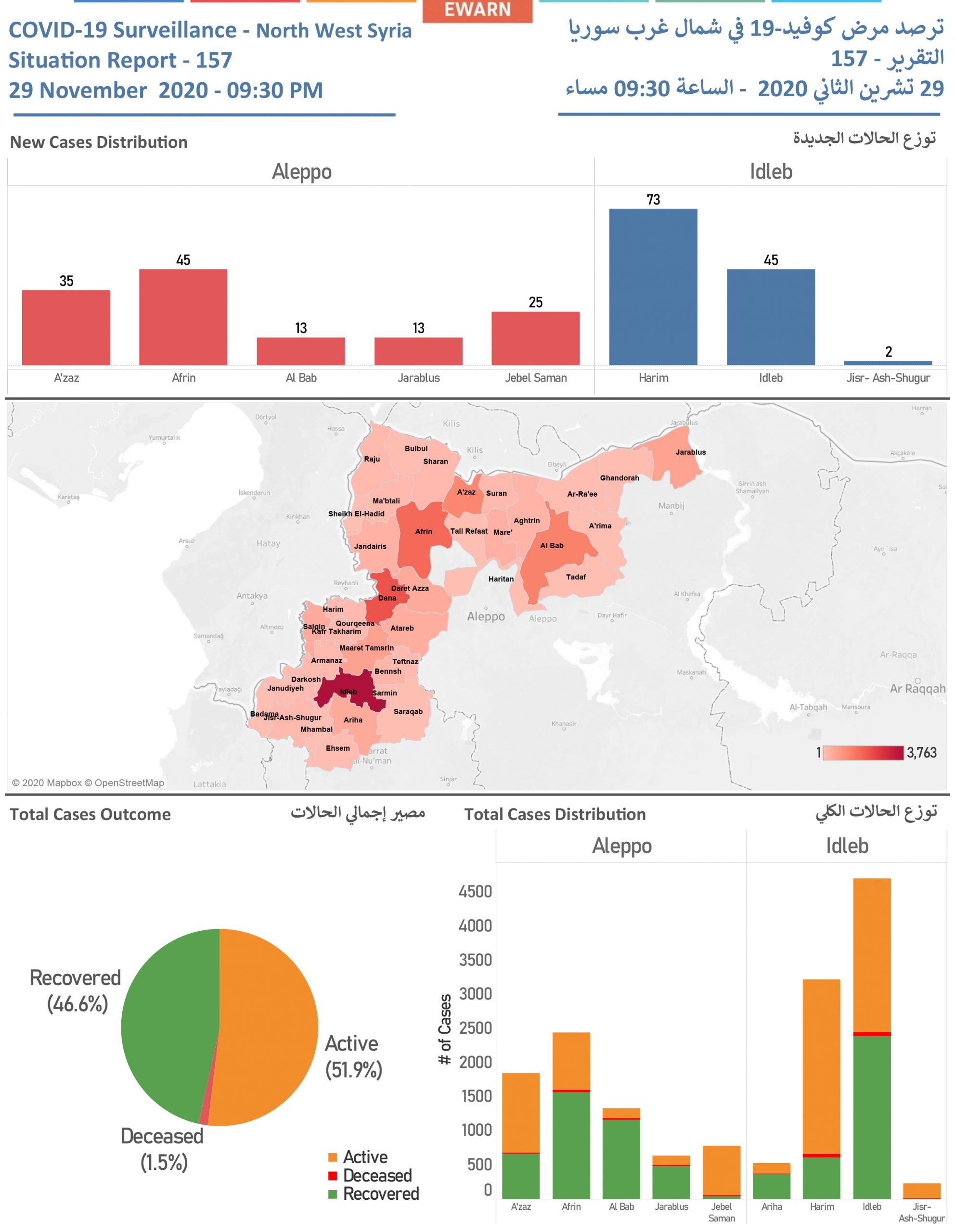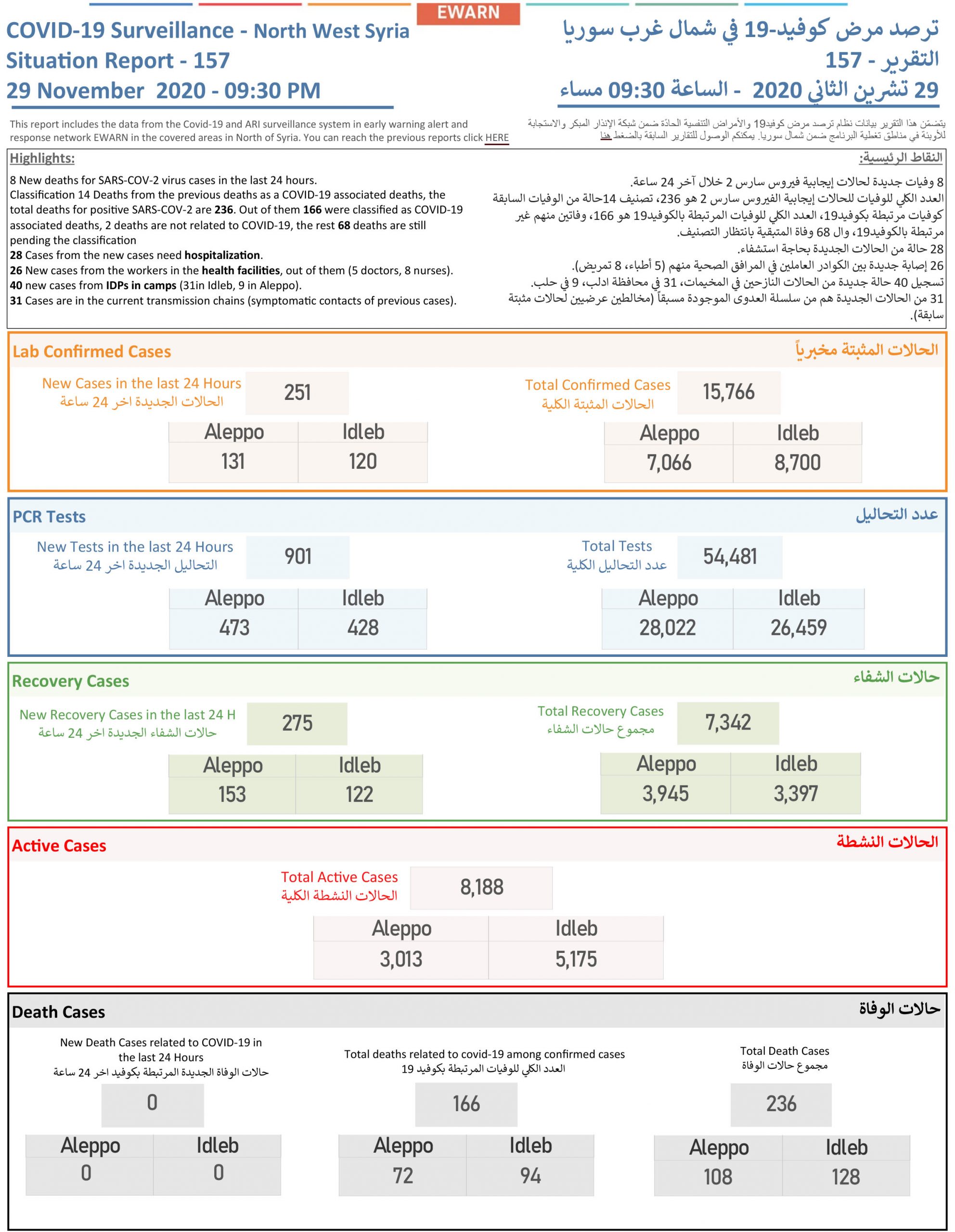 وأكّدت أيضاً تسجيل 14 حالة وفاة لترتفع حصيلة الوفيات في الشمال السوري المحرر إلى 166.